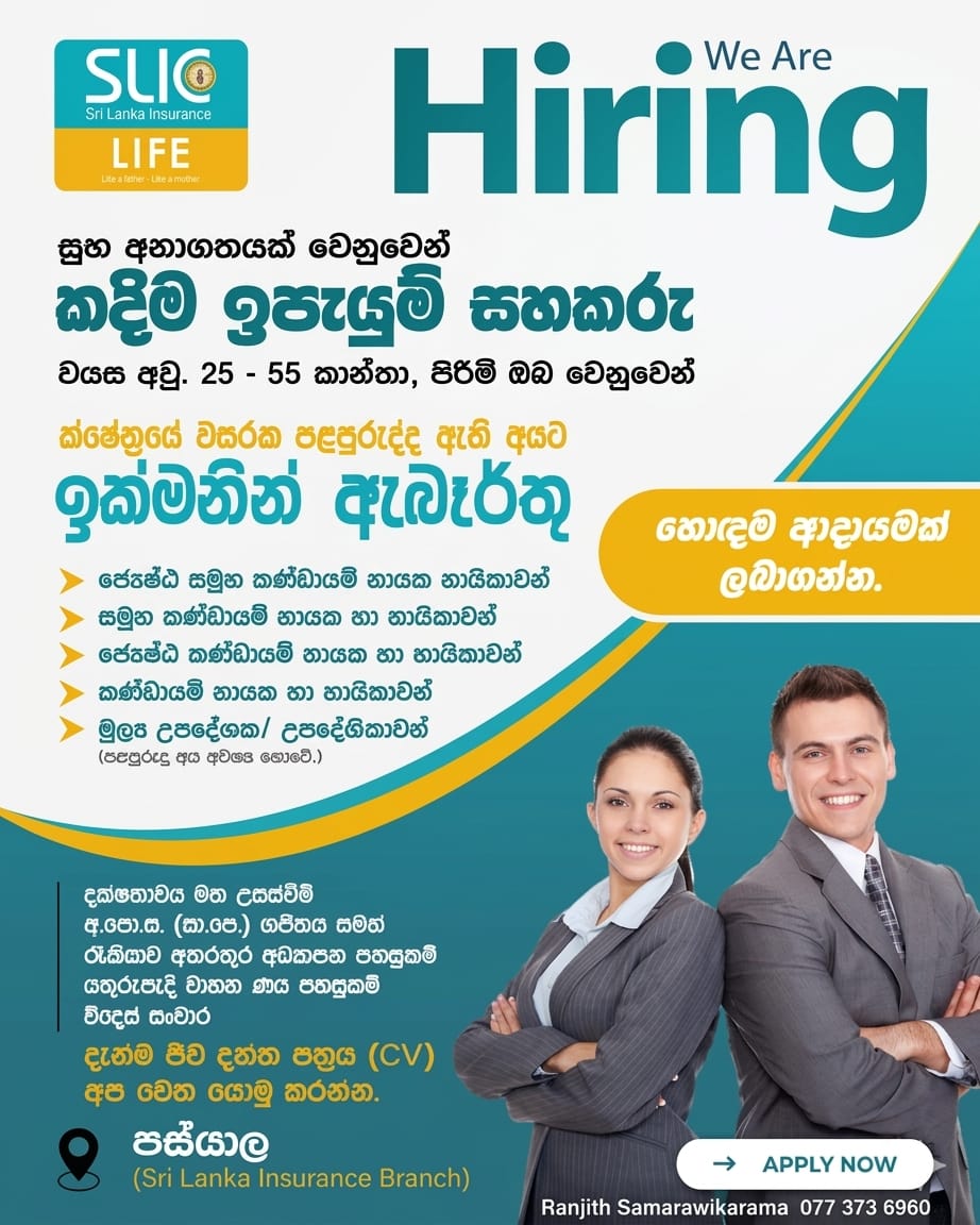 Full time @SRI LANKA INSURANCE PASYALA BRANCH posted 2 weeks ago in Banking, Insurance & Financial Services Shortlist Email JobJob Detail