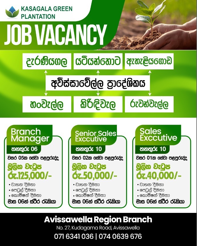 Full time @KASAGALA GREEN PLTATIONAN Avissawella Branch posted 3 days ago in Marketing, Sales & Business Development Shortlist Email JobJob Detail